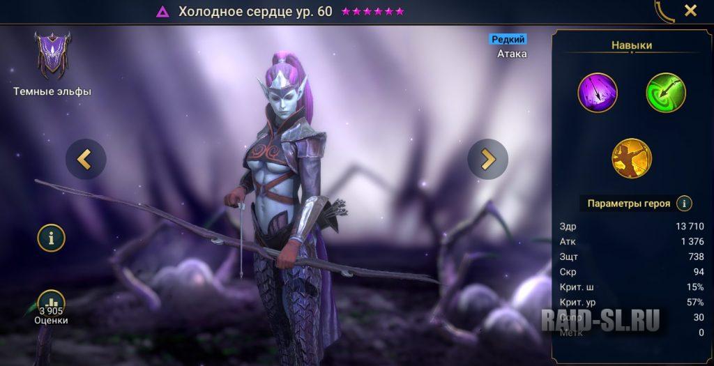 Один из самых желанных и полезных героев в игре. Крайне полезная в большей части PvE контента игры, но особенно хорошо проявляет себя в Логове Паучихи и на Лавовом Рыцаре. Очень нетребовательна к экипировке и имеет стихию Тьмы. Основное её минус в том, что у нее очень низкие показатели Здоровья и Защиты, а это значит что про эти характеристики не стоит забывать, а так-же то что в режиме авто-боя она сначала использует А2, а только потом А3.