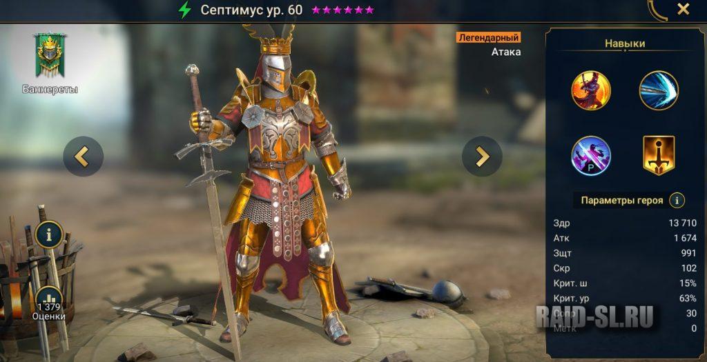 Вы наверное уже успели удивиться, но мы ничего не перепутали – Септимус имеет самую мощную атаки из всех МЗЦ героев в игре на момент версии 1.12. Он крайне редко используется, так как на текущий момент его А2 по какой-то неведомой нам причине, не работает на Авто-бое. Его А2 имеет прибавку 25% при прокачке книгами, а пассивный навык дает целых +30% урона если у цели более 50% Здоровья. Мы проводили тест, в одинаковой экипировке, там где Холодное Сердце выдает 1.800.000-2.000.000 урона, Септимус при таких же условиях выдавал 2.400.000-2.800.000 урона.