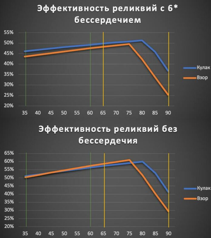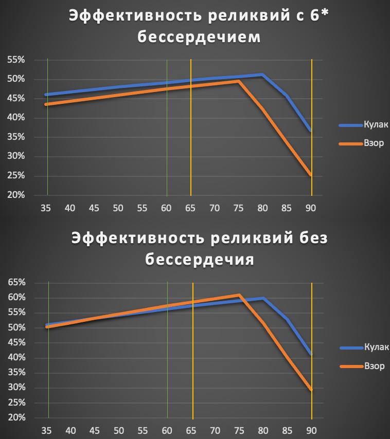 Результаты следующие: Несмотря на явную доминацию Взора против бронированных соперников в среднем диапазоне игнора – Кулак превосходит аналог в интересующей нас области – 2,5% эффективности для Тита до 6* и 6,5% для 6* Тита – связано это с тем, что лишние 9% игнора в таких условиях не дает преимущества над чистыми 10% урона.
