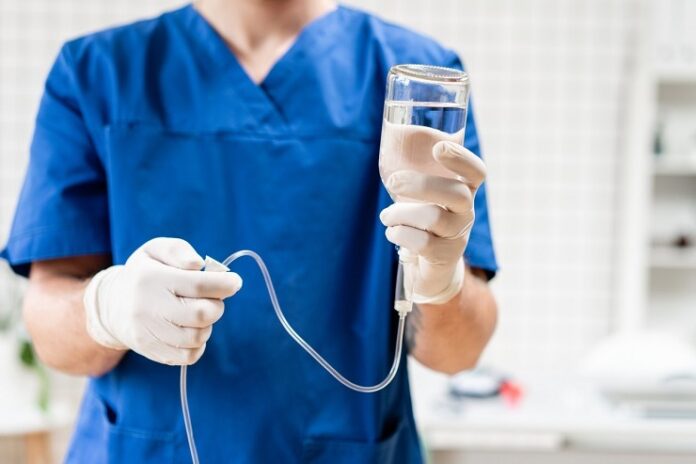Medical treatment emergency concept. Doctor holding drip and adjust infusion pump set iv fluid. Intravenous drop saline drip for seriously patient in the emergency room at hospital.