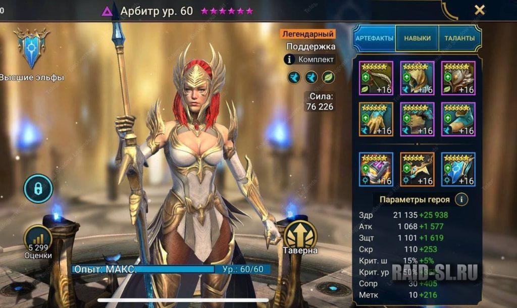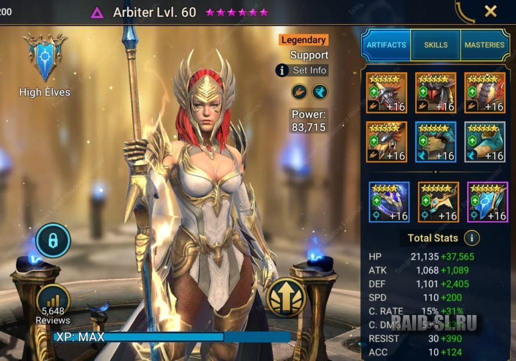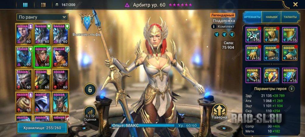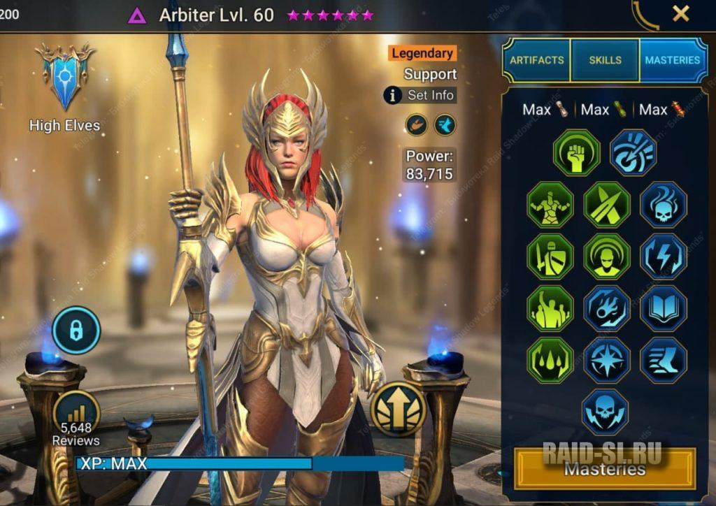 Арбитр это пожалуй самый легендарный герой из всех. Именно она является рассказчиком всей истории мира игры Raid: Shadow legends — Телерии. Она является героем Поддержки. И является частью фракции Высших эльфов. Более того, именно ее дадут игрокам за полное прохождение цепочки квестов.