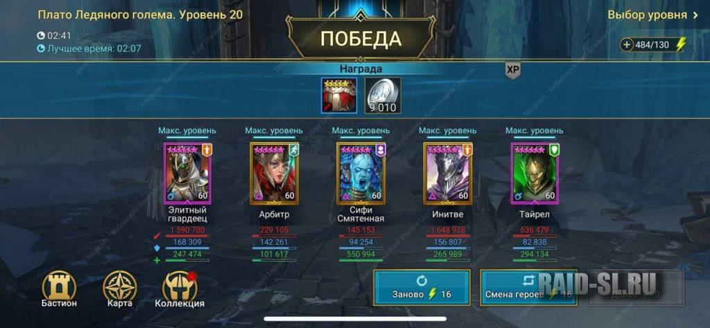 Тут мы видим отличную скорость, более чем 300% Критического урона и прекрасная Атака. Как мы понимаем в такой сборке он отлично зайдет против Ледяного голема и в Войны фракций. Но также он может себя отлично показать на Арене.