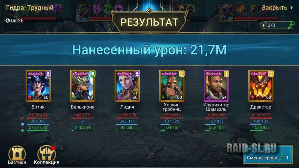 Как мы видим, тут используются абсолютно негидровые на первый взгляд герои, такие как Валькирия (чьи щиты с контрой так и хочется украсть, а контра так и активирует голову дд), Дрекстар, который тут единственным дд набивает на ключ, Вития с массухой на а1. Шмот весь здесь добыт с кузни. При желании даже без топов вы можете брать с ключа вторую гидру, главное, поймите как ее бить и пробуйте составлять пачки.