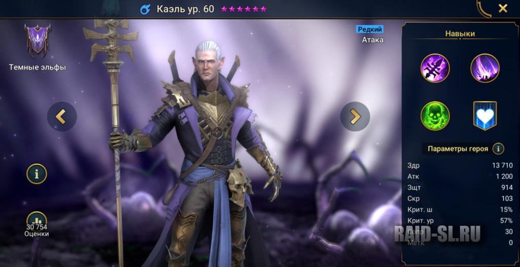 Каэль герой фракции Темных эльфов, является героем Атаки. Он так же наносит АоЕ урон по противникам. Он не наносит прямой урон, как Элейн, но накладывает отравление. Он плох в фарме, но отлично подходит для Арены и против боссов. Одним словом он очень хорош для поздней игры.