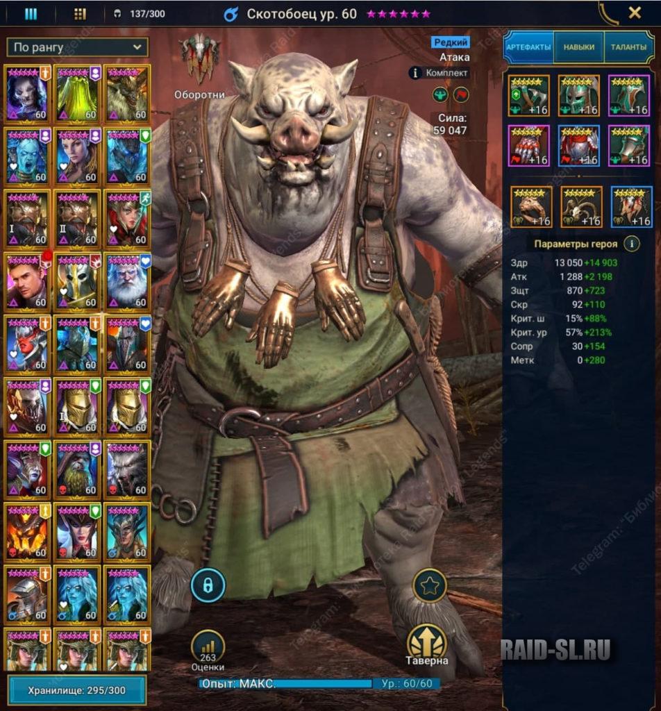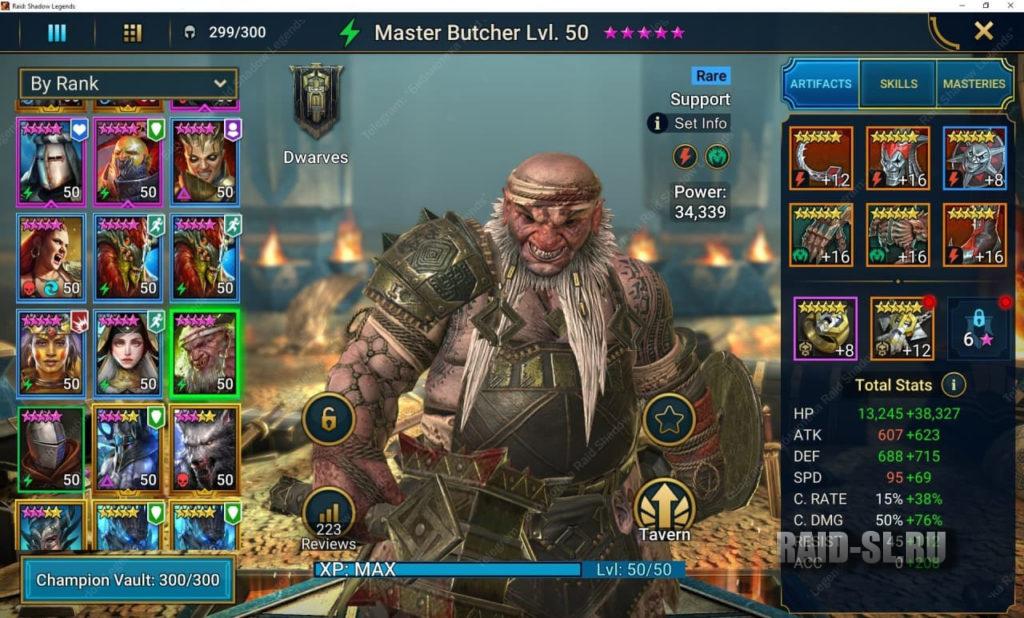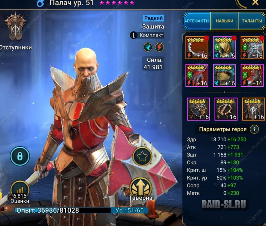 Не смотря на то, что у данного героя довольно посредственные а1 и а2, он хорош своими пассивными навыками. Один из пассивных навыков лечит команду на количество нанесенного урона, что отлично сочетается с провокацией на 1 и 2 навыке, другой пассивный эффект воскрешает союзника при смерти забойщика. Помимо 4 потайной комнаты он так же является ключом к 1 из стратегий прохождения Боммала, туда ему обязателен сет беспощадности и статы показанные на скрине.