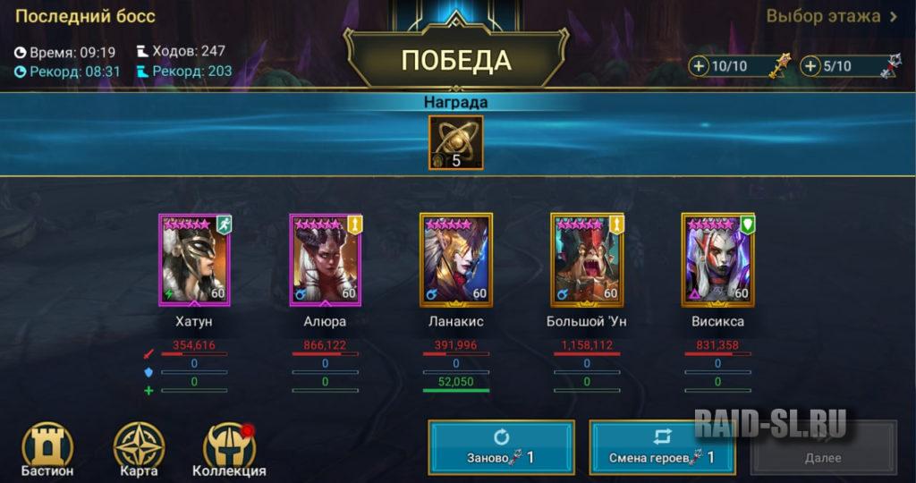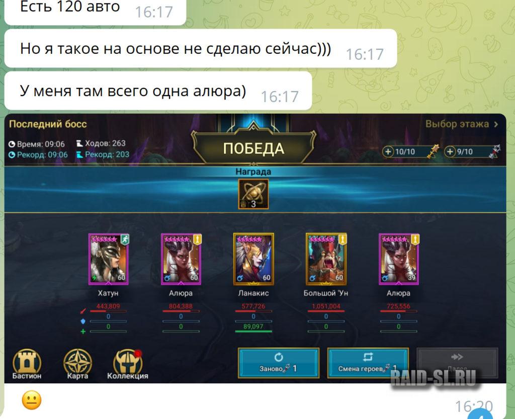 Босс жирный, но хорошо режется полоска хода, по сути вся сложность только в том, что она копирует вашу команду с вашим же шмотом ;). Но так как вы в атаке у вас все же право первого хода есть.