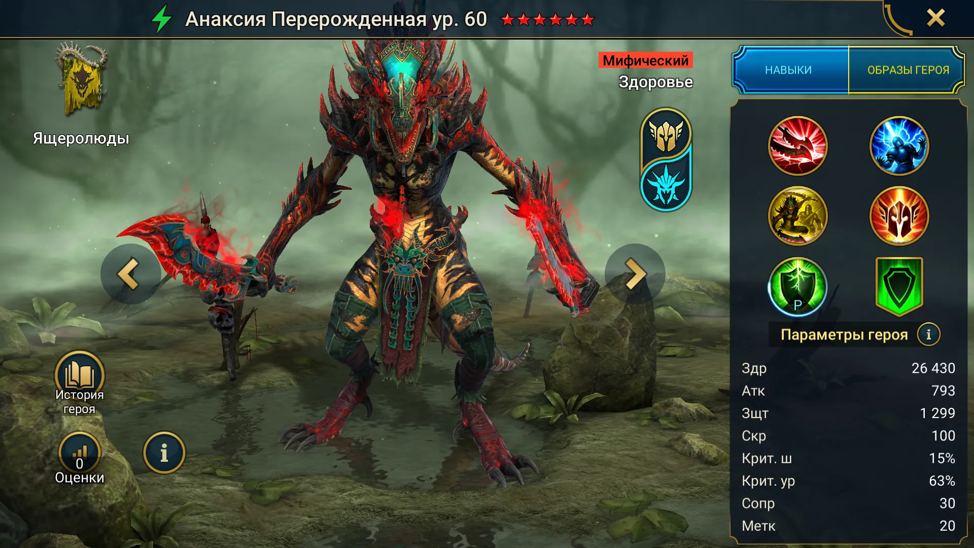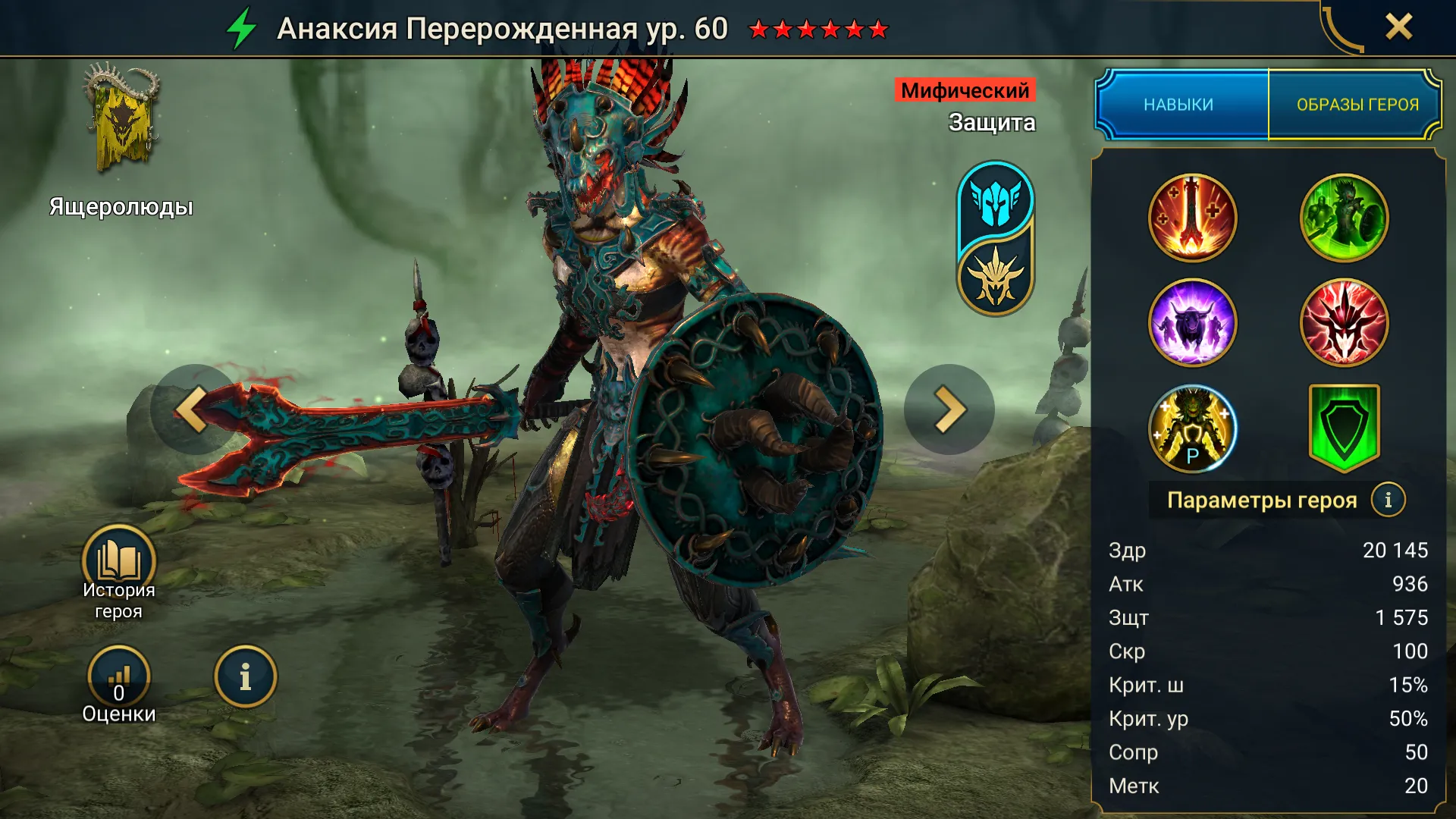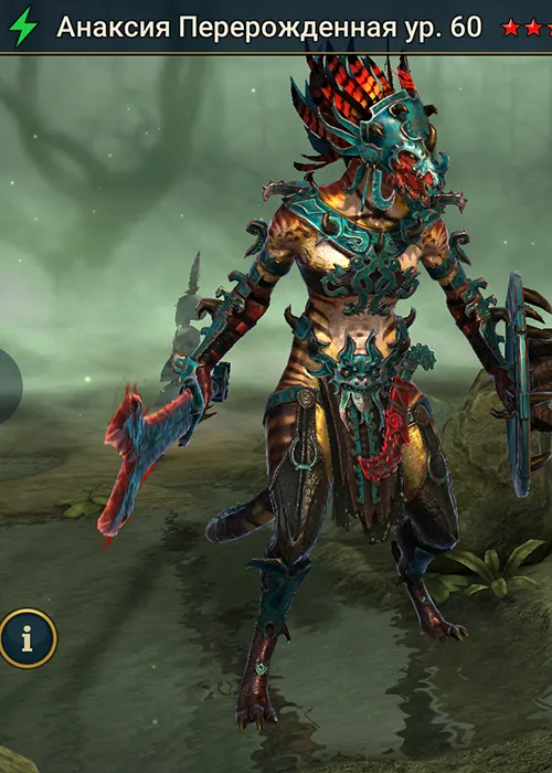 Анаксия Перерожденная Raid Shadow Legends — новый мифический чемпион из фракции Ящеролюды в стихии Дух, она выступает в роли героя, обеспечивающего защиту и здоровье.