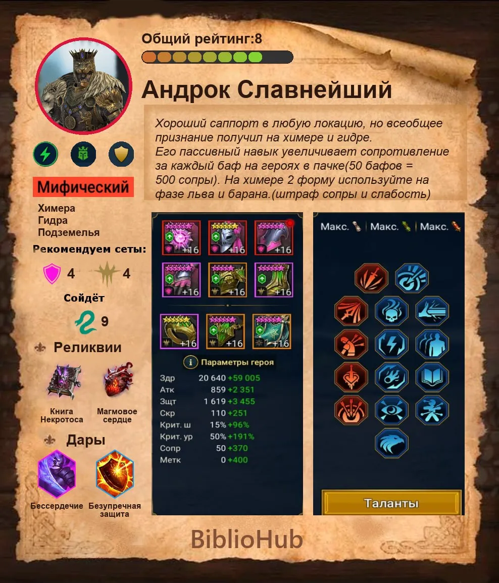 Андрок Славнейший – мифический герой Защиты и Поддержки зелёной стихии Духа из Телерийской фракции Баннереты с аурой на Защиту во всех боях. В игру RAID Shadow Legends был добавлен в феврале 2024 года. Этот рыцарь в образе льва обладает редким штрафом Изнурения, который преподносит соперникам неприятный сюрприз. Способен хорошо сейвить и лечить своих союзников.