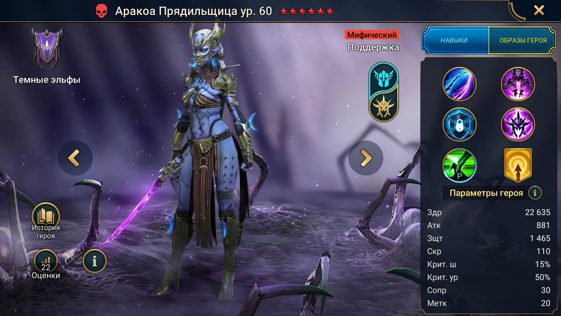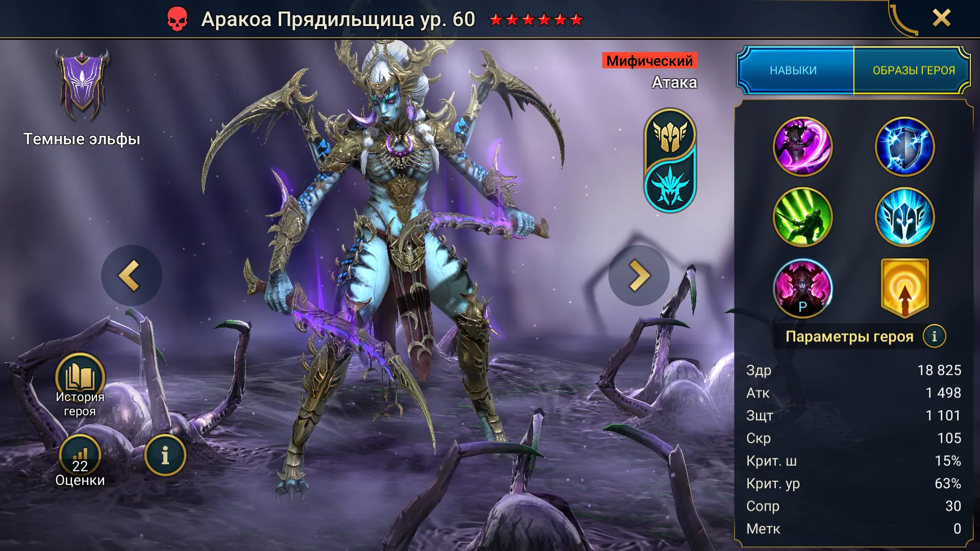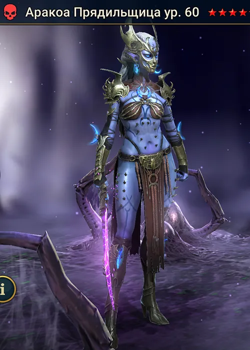Аракоа Прядильщица Raid Shadow Legend – мифический чемпион фракции Темные Эльфы, играет в роли атаки и поддержки, в стихии Силы. Аракоа – герой, который в равной степени воплощает контроль и исполнение.