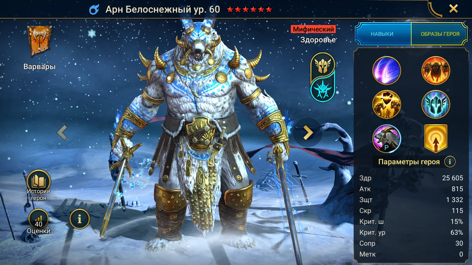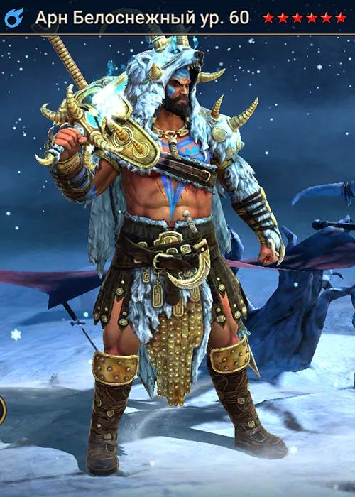 Арн Белоснежный Raid Shadow Legends — новый мифический наносящий урон чемпион из фракции “Варвары” в стихии Магия, из Лиги Телерии. Этот герой доминирующий в PvP и некоторых режимах PvE благодаря механике Смертельного клейма в своей базовой форме. В своей альтернативной форме он получает массовое Провокацию, Снижение защиты и контролирующие контратаки, что делает его живучей, мощной угрозой с элементами поддержки и контроля толпы.