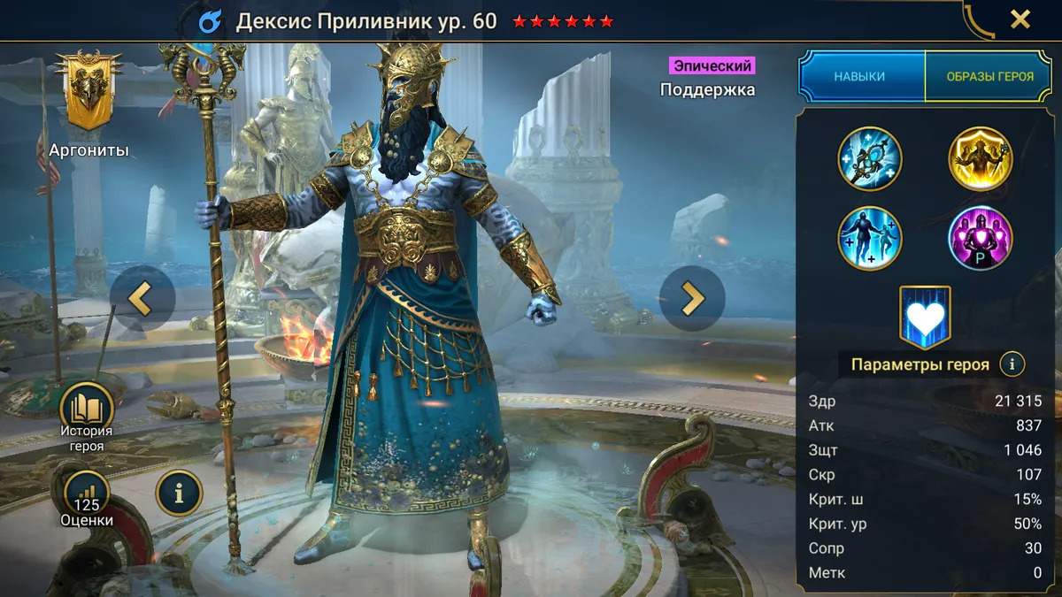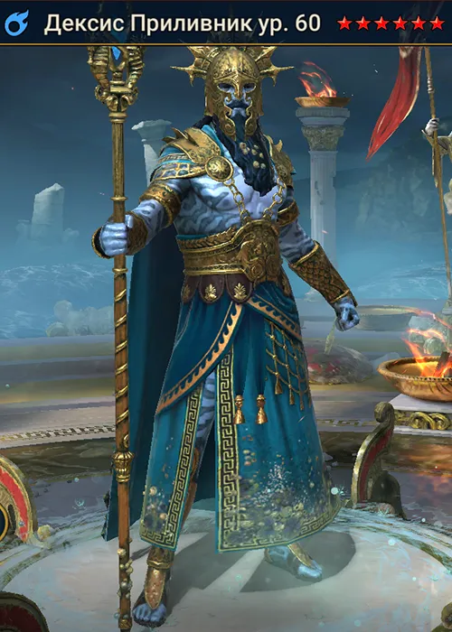 Дексис Приливник Raid Shadow Legends — это эпический чемпион из фракции «Аргониты» из «Ниресийского Союза», обладающий магическим типом атаки и классом «Поддержка». Он выполняет роль рейзера, ориентированного на выживание отряда: накладывает на союзников баффы на защиту и повторяющиеся щиты, что делает его незаменимым в затяжных боях и при прохождении контента фракции.