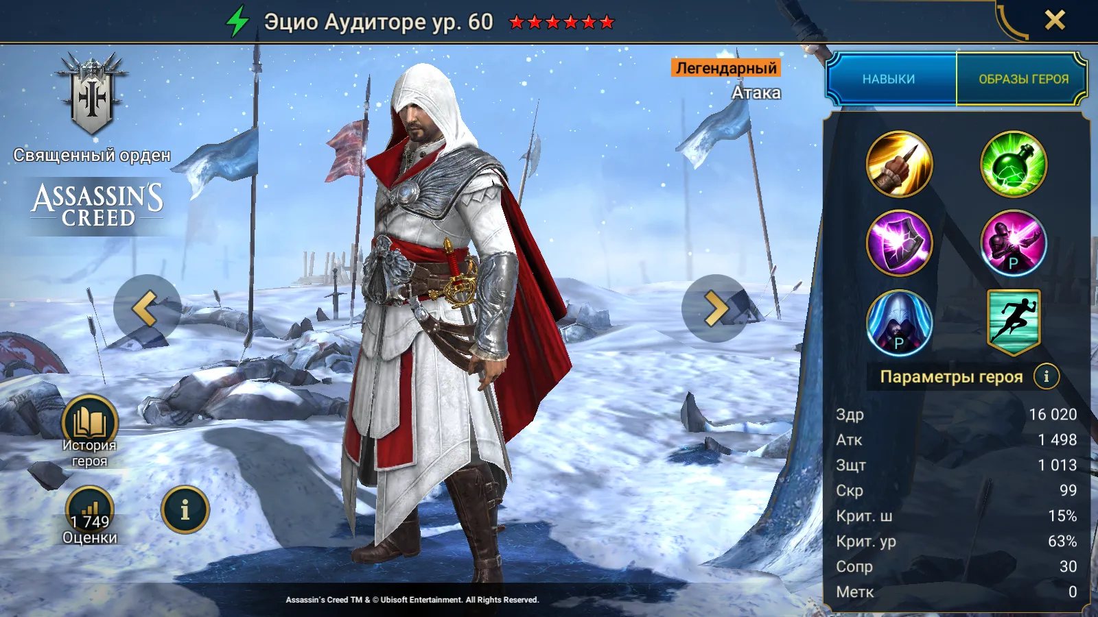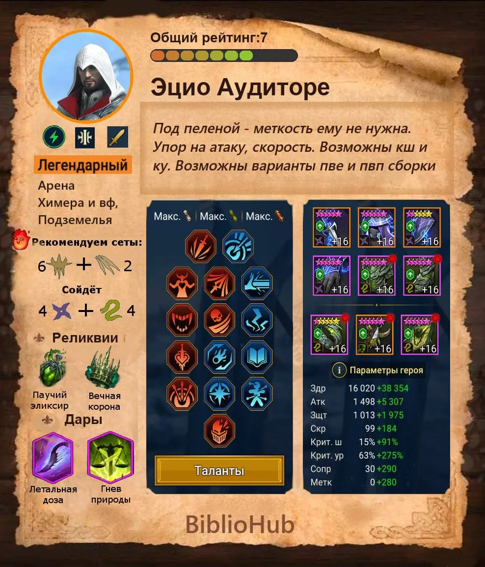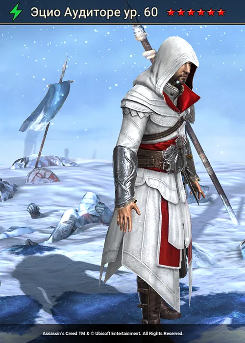 Эцио Аудиторе Raid Shadow Legends – легендарный атакующий фьюжн – чемпион из фракции Священный орден, относящийся к стихии Дух стал доступен в январе 2026 года в рамках 14-дневной Программы Лояльности коллабы со вселенной Assassin’s Creed. Он является атакующим бойцом и накладывающим дебаффы героем, который превосходно проявляет себя в PvP, оставаясь полезным и в PvE-волнах, и в сражениях с боссами.