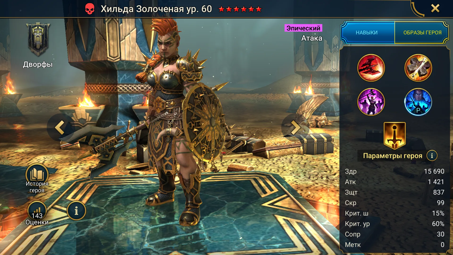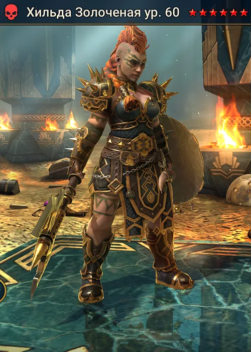 Хильда Золоченая Raid Shadow Legends — это эпический атакующий чемпион фракции “Дворфы”, герой стихии Сила. Она расцветает в хаосе битвы, нанося все более сокрушительные удары по мере ослабления врагов.