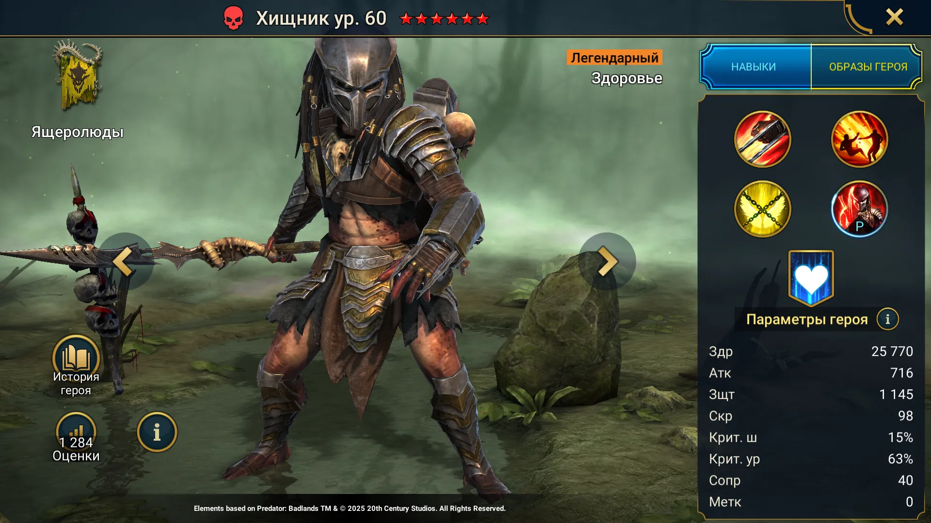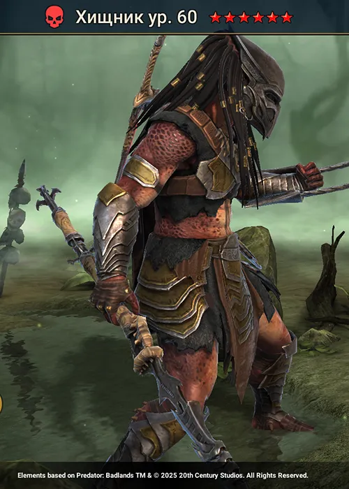 Хищник Raid Shadow Legends — это легендарный фьюжн-чемпион из фракции Ящеролюды в стихии Сила, который выступает в роли героя сохранения Здоровья в своей команде. Хищник появился в Raid через Пропуск чемпиона в рамках коллаборационного ивента «Хищник: Бесплодные Земли», и ожидается, что в будущем он будет появляться в ивентах с шарами.