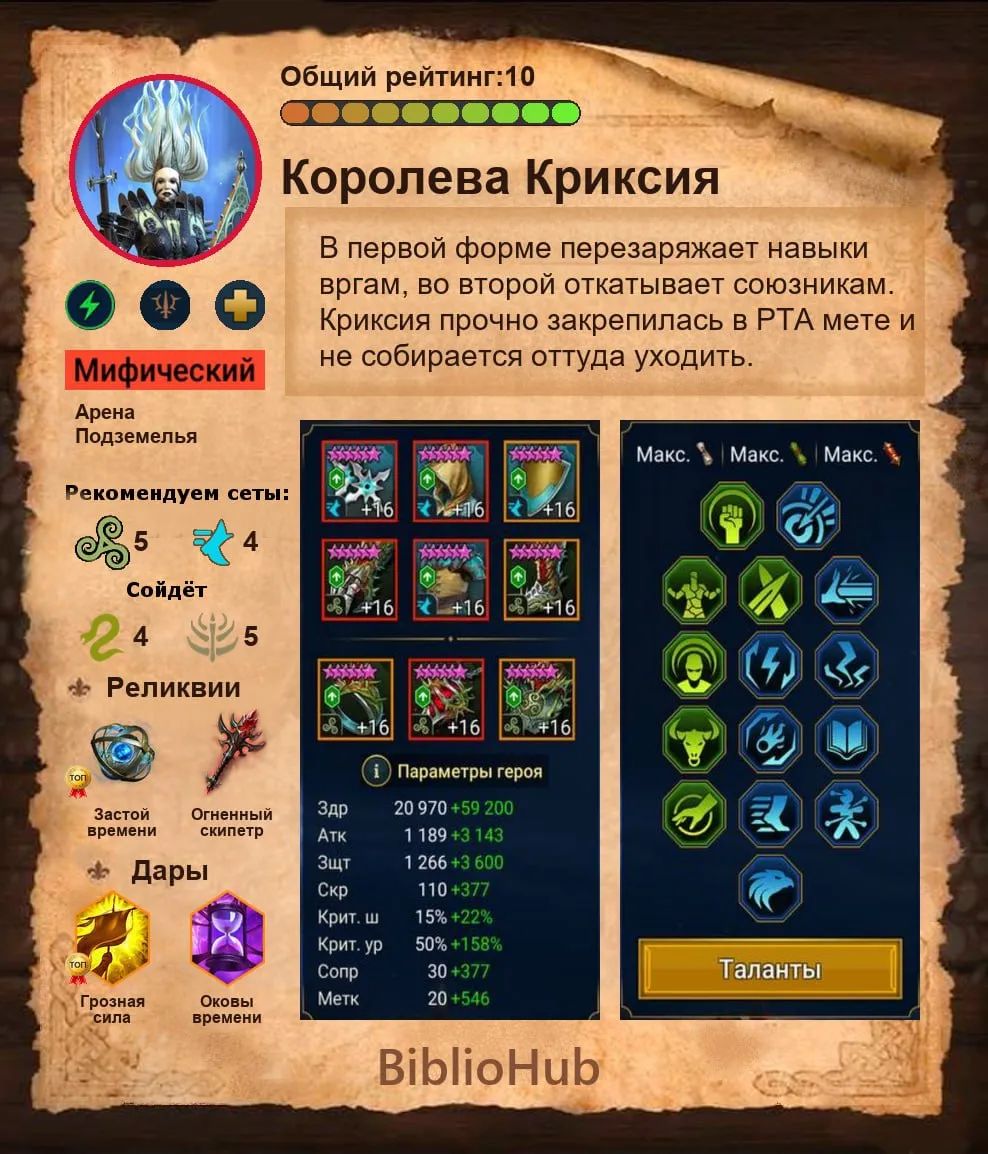 Королева Криксия – Мифическая героиня Поддержки зелёной стихии Духа из падшей фракции Отступники с аурой на сопротивление во всех боях.  Прекрасный клинсер от штрафов с продлением КД навыков на всех противников и сокращением перезарядки у союзников. Пожалуй лучший мифик на момент своего выхода в игре RAID: Shadow Legends.