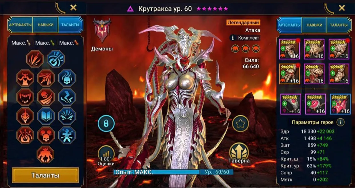 Крутракса Raid Shadow Legends – это легендарный герой из союза “Падшие” фракции “Демоны”. Это потрясающего вида демонесса. Ее доспехи сияют платиной в адских отблесках преисподней. Она появляется на поле боя с огромным копьем, которое легко игнорирует половину защиты врага, ослабляет своих врагов, снимает с них бафы. Кроме этого, она способна вешать на себя возрождение, что бы после поражения снова восстать и сражаться. Этот герой очень ценится игроками.