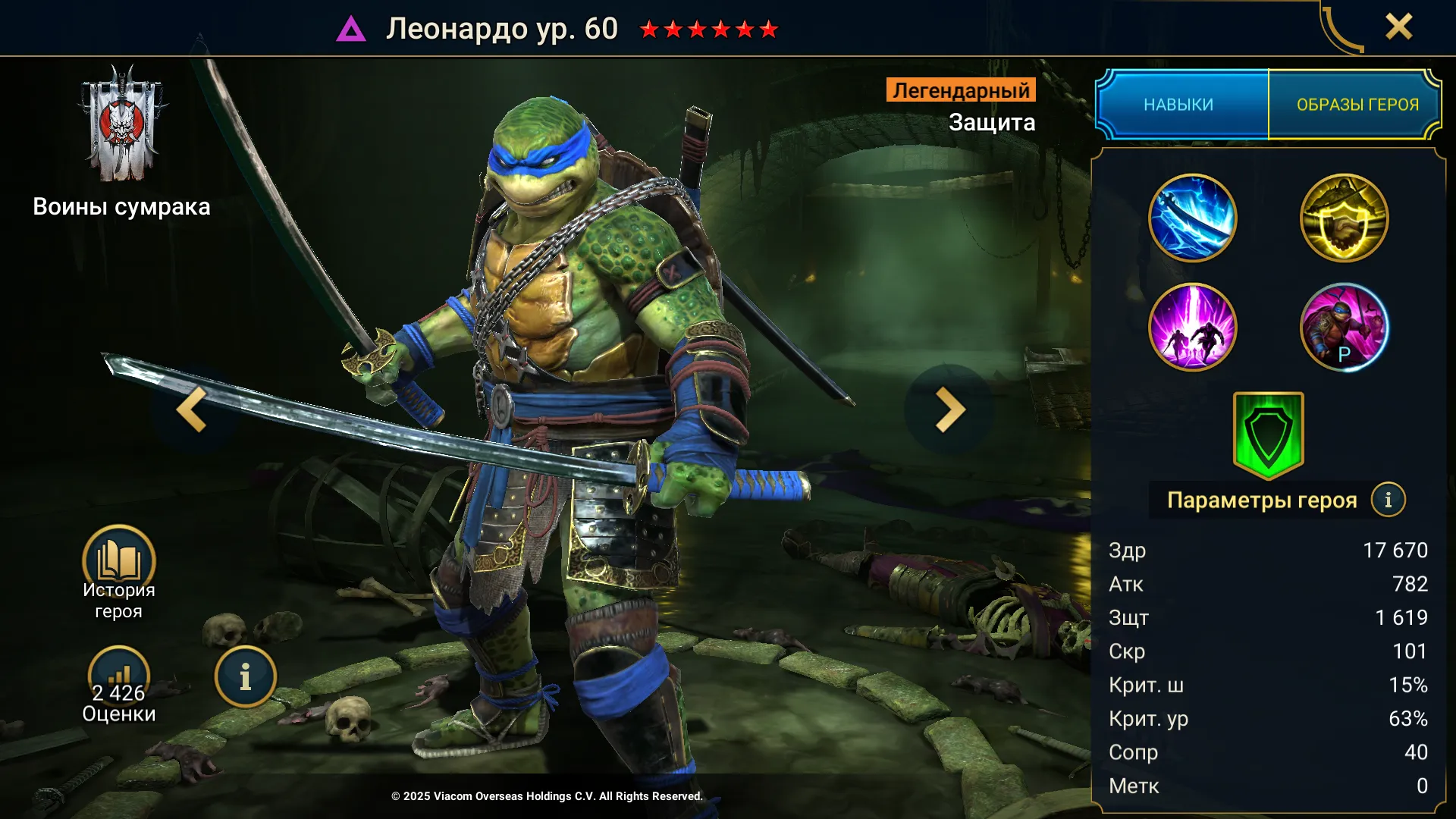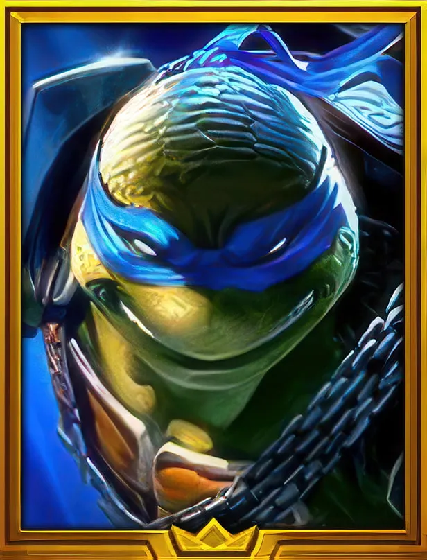 Леонардо, вероятно, самый желанный чемпион этого коллабора — его эффект единства увеличивает урон в команде с другими Черепашками, а навыки обеспечивают как мощный урон, так и защиту. Его ключевая синергия начинается с применения навыка А2, который даёт команде Усиление Защиты и Защиту Союзника, а ему самому — «Бессмертие» и «Контратаку».