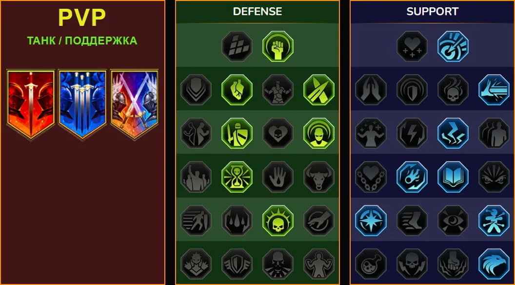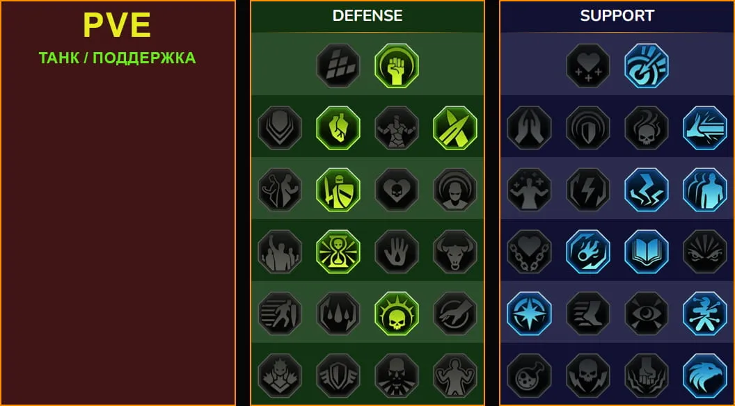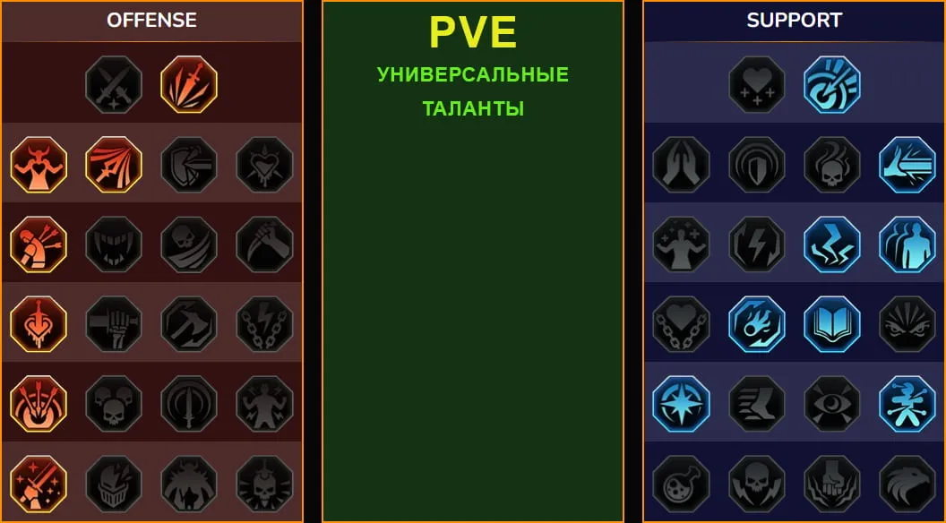 - Ветка Поддержка обязательна: берутся мастерства на увеличение длительности баффов, снижение откатов, дополнительное заполнение Шкалы хода.