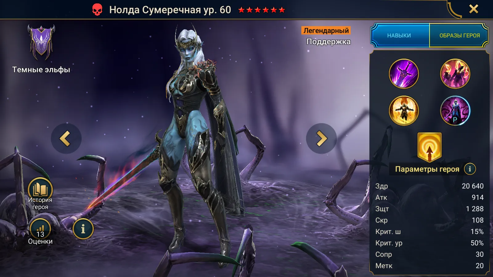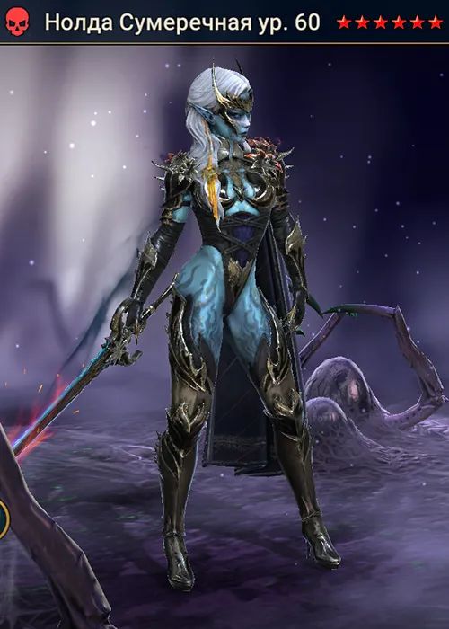 Нолда Сумеречная Raid Shadow Legends — это легендарный чемпион поддержки из фракции “Темные эльфы”, стихии Сила и союза Падших. Нолда выступает как мощный гибридный персонаж поддержки, получение которого приурочено к событию по сбору фрагментов. Её специализация — снятие баффов, воскрешение и противостояние скоростным командам. В паре с Соланаром Рассветным её сила многократно возрастает благодаря неотразимым дебаффам, пассивному заполнению шкалы хода и усилению атаки союзников.