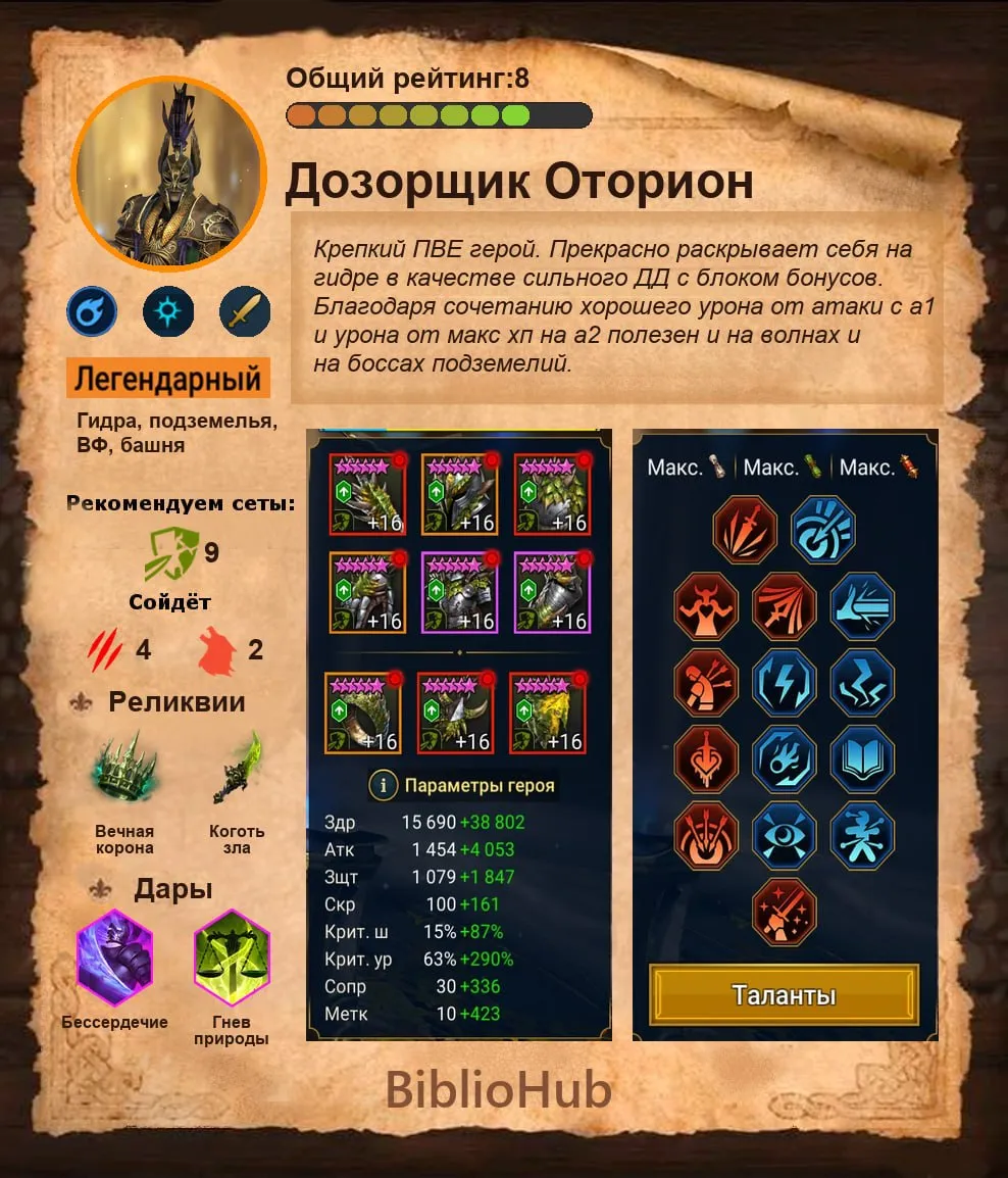 Для экипировки Дозорщика Оториона рекомендуется использовать артефакты, повышающие атаку и меткость, такие как комплекты Кража Жизни или Жестокость. Таланты так же следует выбирать с акцентом на атакующую и защитную ветки, чтобы максимально раскрыть его боевой потенциал.