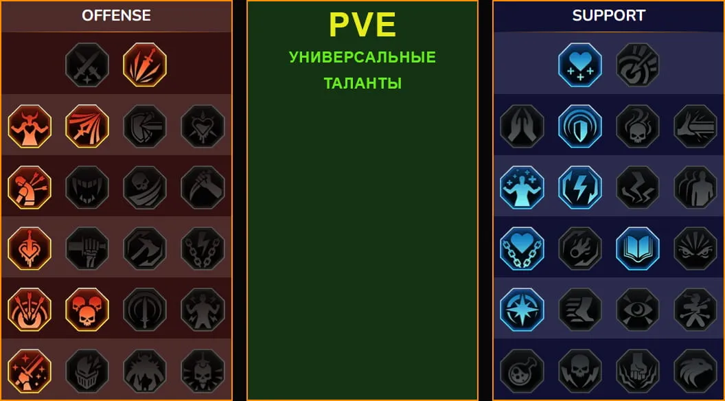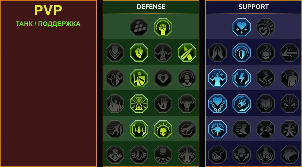 Оптимально взять ветку Защита (Defense) для повышения выживаемости и поддержки, а вторую ветку — Поддержка (Support) для ускорения перезарядки навыков (шанс сброса кулдаунов) и продления баффов. В частности, талант «Цикл магии» может иногда помочь сократить 4-х тактную перезарядку провокации.