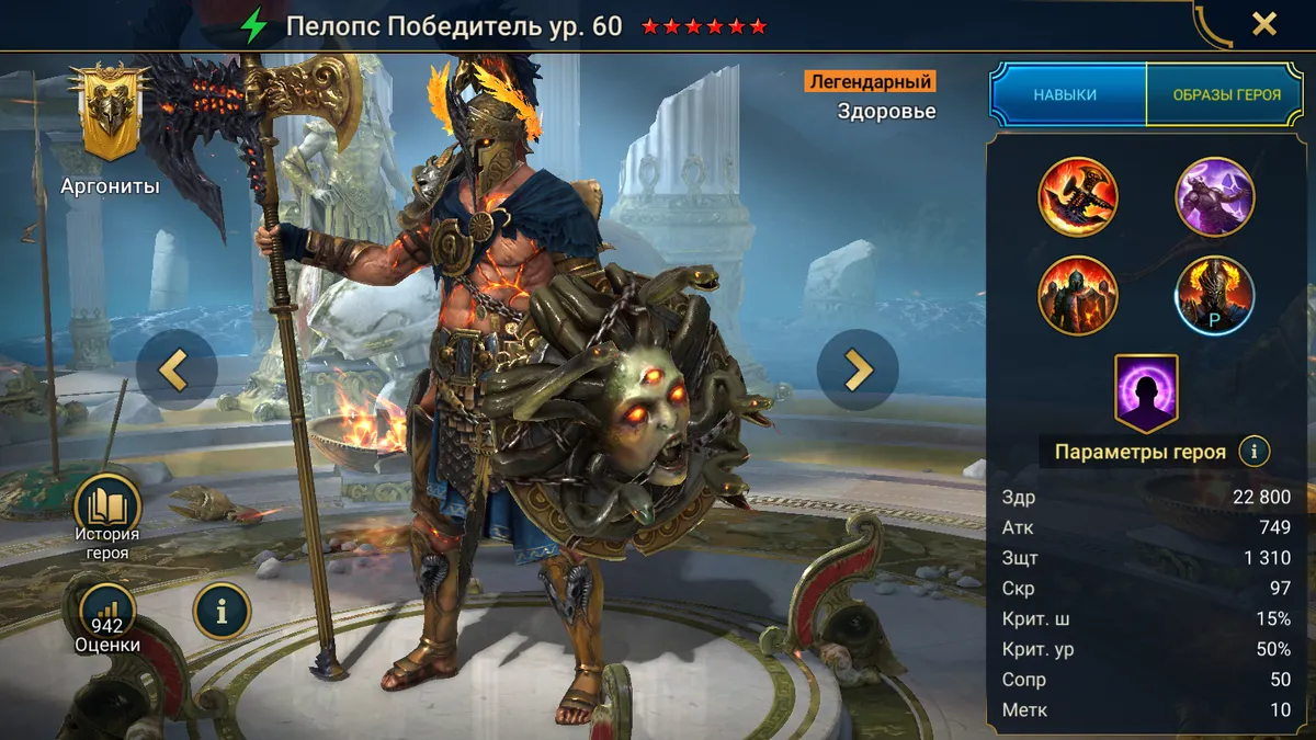 Арена (нападение и защита): Пелопс может выполнять роль танка-провокатора, нейтрализуя ключевого вражеского дамагера через Провокацию и пассивное Окаменение. А2 позволяет точечно убивать или оглушать наиболее опасных противников. На защите он опасен тем, что любой удар по нему может привести к Окаменению атакующего.