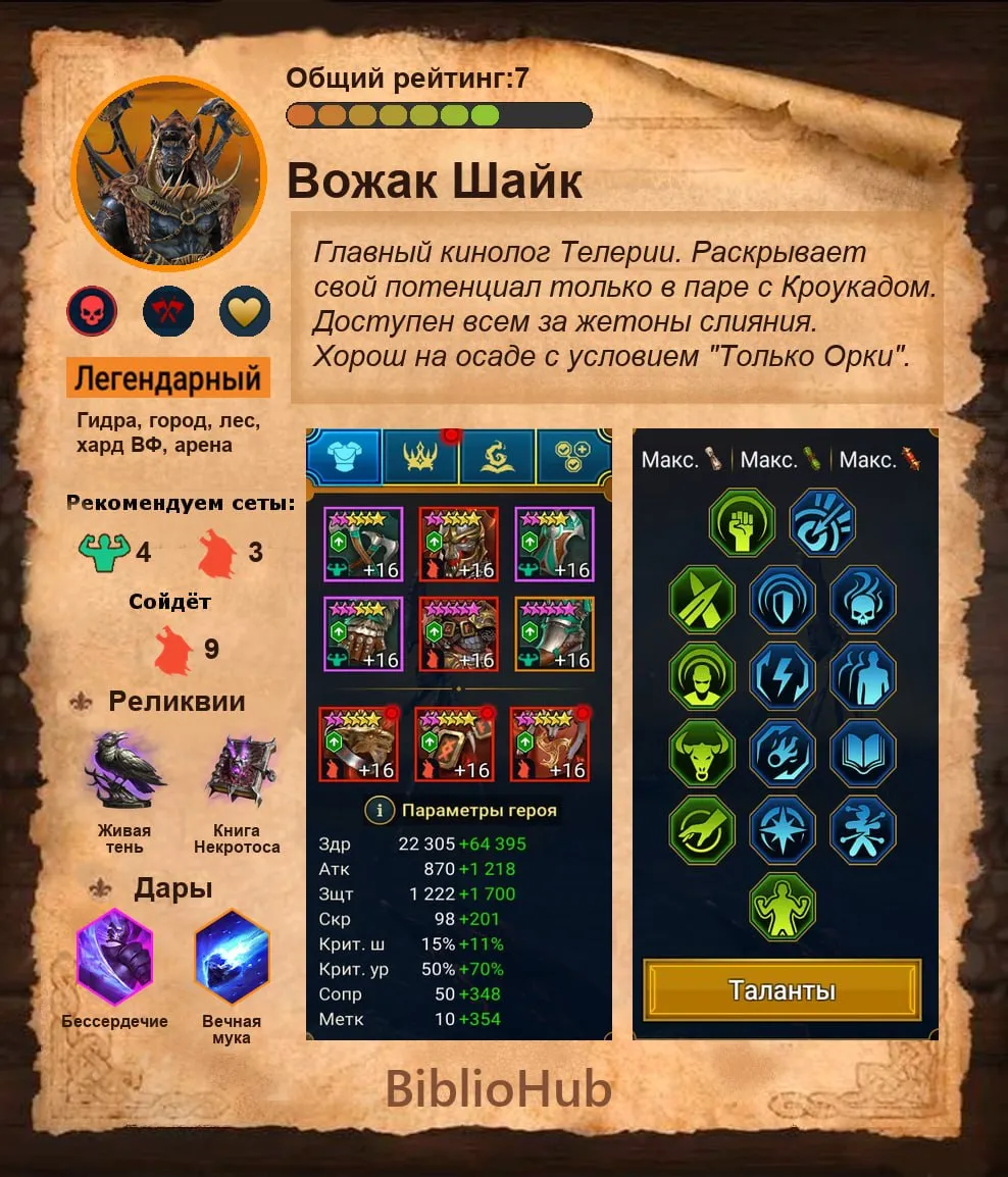 В диких землях Телерии Вожак Шайк внушает уважение и страх всем, кто встречается на его пути. Как легендарный чемпион класса HP из фракции Орков, Шайк обладает уникальной способностью использовать силу своей стаи для усиления собственной мощи.