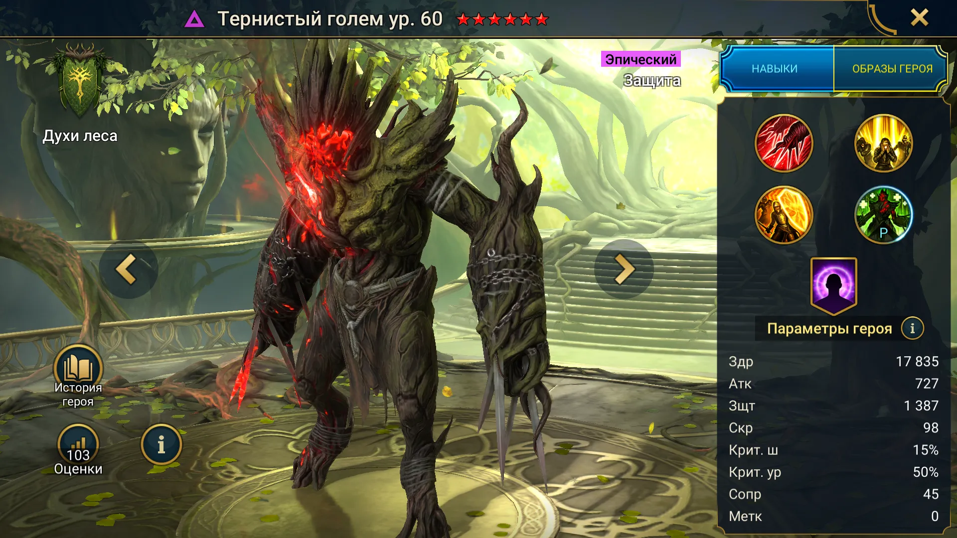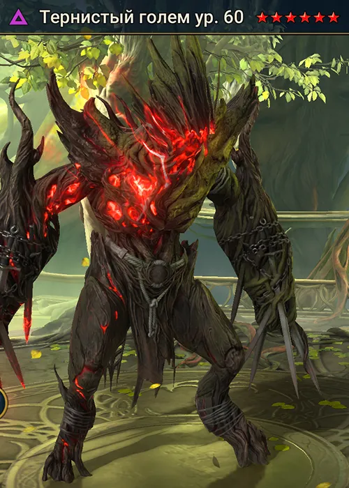 Тернистый Голем Raid Shadow Legends — это эпический защищающий чемпион из фракции «Духи Леса», герой стихии Тьма. Этот боец был выпущен как эпический чемпион, необходимый для слияния Мари Кровавницы, и обладает набором умений, сфокусированным на контроле толпы и поддержке команды.