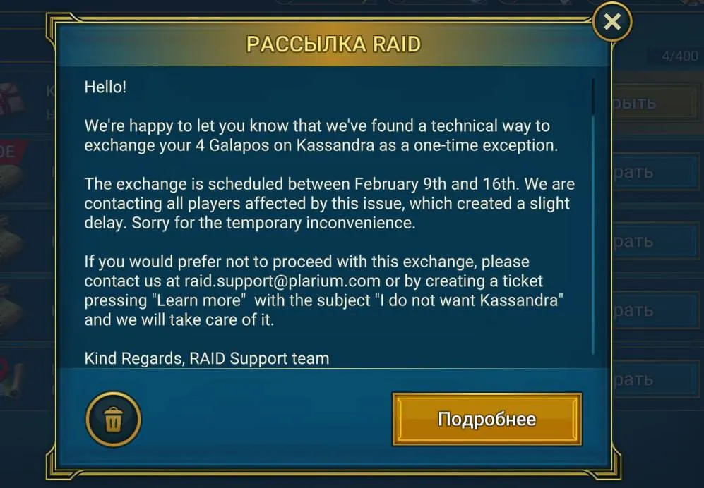 Если вы предпочитаете отказаться от этого обмена, пожалуйста , свяжитесь с нами по адресу raid.support@plarium.com или создайте заявку, нажав “Узнать больше” и указав в теме письма “Я не хочу Кассандру”, и мы позаботимся об этом.