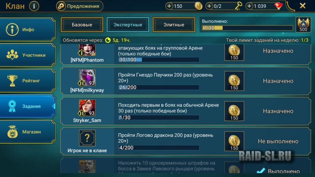 Каждому участнику Клана доступно до 3 Заданий в неделю, а прогресс по всем Заданиям отмечается одновременно. Имена и аватары игроков отображены рядом с Заданиями, которые они взяли.