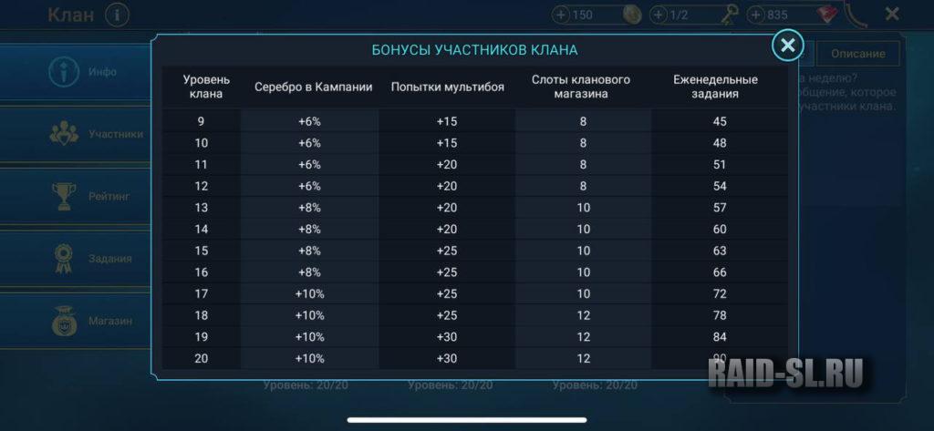 В зависимости от уровня Клана участники получают такие бонусы:
