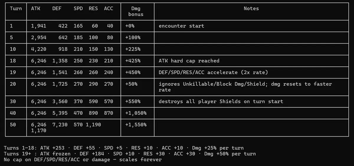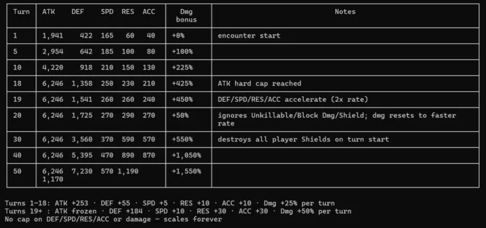 На картинке изображено, как меняются статы босса от хода к ходу, к 50-му ходу КБ будет иметь 890 сопры, 870 меткости и 570 спд.