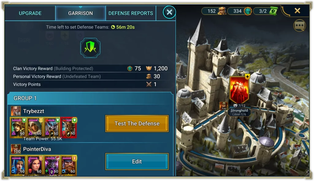 Во время фазы подготовки, после расстановки Оборонительной команды, любой член клана сможет провести пробный бой, нажав на кнопку «Протестировать защиту» рядом с отрядом Героев напротив слота гарнизона.