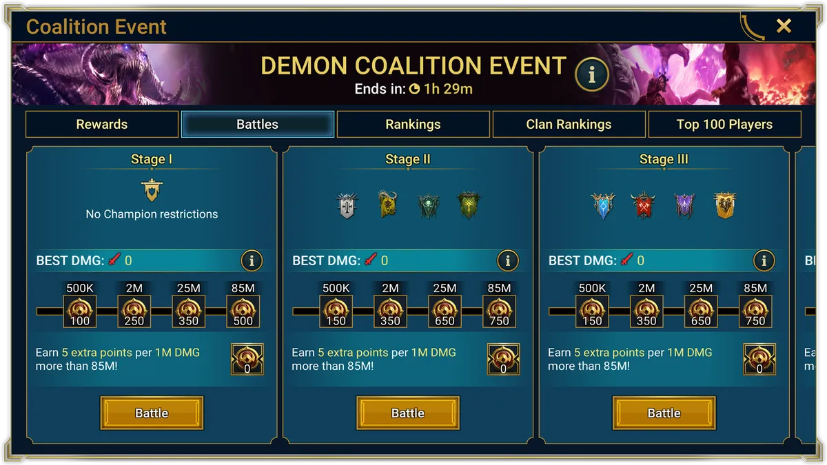 Каждый этап имеет 4 Отметки (урон). Достижение этих Отметок приносит Очки демоноборца. А если вы превысите последнюю Отметку, вы получите Бонусные очки за множитель избыточного урона.