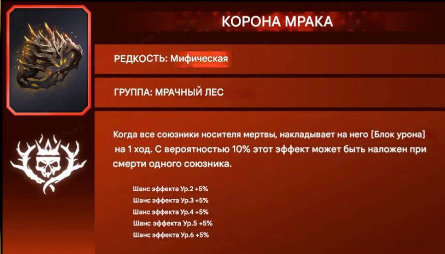 - Корона Мрака – Когда все союзники носителя мертвы, накладывает на него [Блок урона] на 1 ход. С вероятностью 10%(35%) этот эффект может быть наложен при смерти одного союзника.