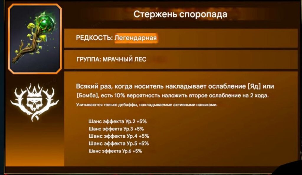 - Стержень споропада – Всякий раз, когда носитель накладывает ослабление [Яд] или [Бомба], есть 10% (35%)вероятность наложить второе ослабление на 2 хода. Учитываются только дебаффы, накладываемые активными навыками.