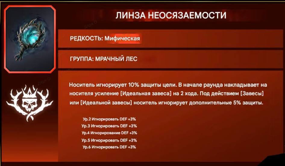 - Линза неосязаемости – Носитель игнорирует 10% (25%) защиты цели. В начале раунда накладывает на носителя усиление [Густая пелена] на 2 хода. Под действием [Пелены] или [Густой пелены] носитель игнорирует дополнительные 5%(20%) защиты.