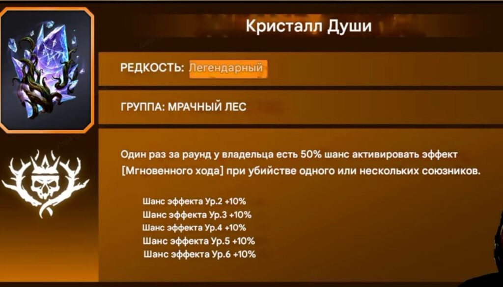 - Кристалл души – Один раз за раунд у владельца есть 50(100%) шанс активировать эффект [Мгновенного хода] при убийстве одного или нескольких союзников.