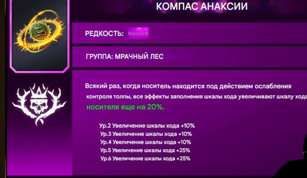 - Компас анаксии – Всякий раз, когда носитель находится под действием ослабления контроля толпы, все эффекты заполнения шкалы хода увеличивают шкалу хода носителя еще на 20%.(100%)