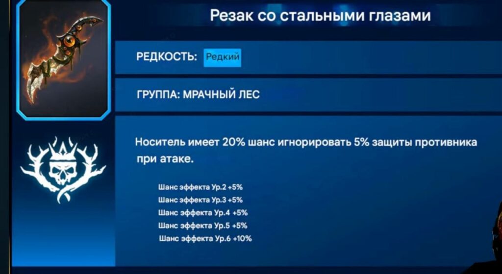 - Резак со стальными глазами – Носитель имеет 20%(50%)шанс игнорировать 5% защиты противника при атаке.