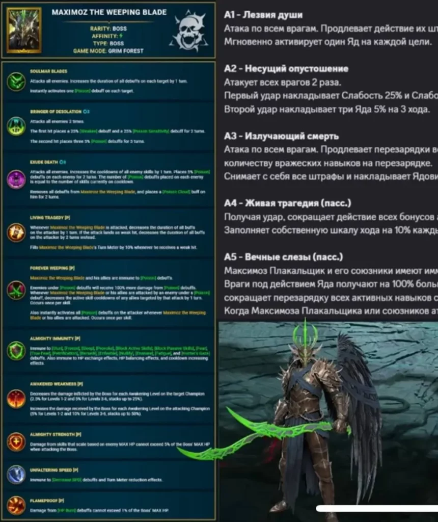 Враги под действием Яда получают на 100% больше урона от этого штрафа. Когда Максимоза Плакальщика или его союзников атакует враг под действием Яда, сокращает перезарядку всех активных навыков союзников, которые стали целью атаки, на 1 ход. Доступно раз в ход.
